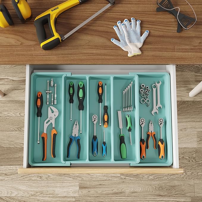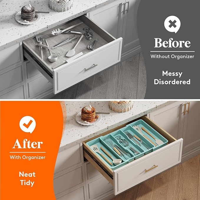 Lifewit Utensil Organizer for Kitchen Drawers, Expandable Cooking Utensil Tray, Adjustable Cutlery Silverware Flatware Holder, Plastic Kitchen Tools and Gadgets Storage Divider, 2 Pack, Turquoise
