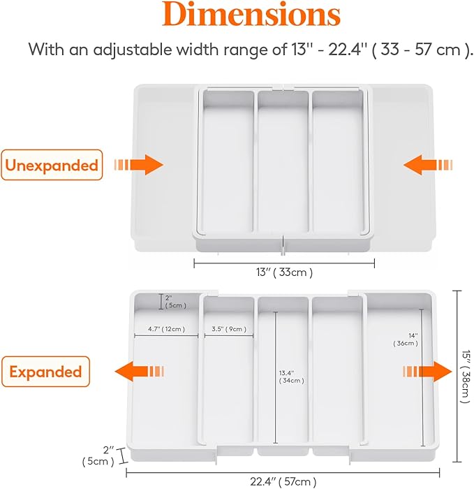 - Expandable & Adjustable: The utensil organiser for kitchen drawers can be expanded from 3 slots to 5 slots, offering extra storage space for utensils. It is adjustable to fit different drawer sizes, ranging from 13 - 22.4 inches wide. When folded, it measures 13" x 15" x 2", but expands to 22.4" x 15" x 2" for added space.