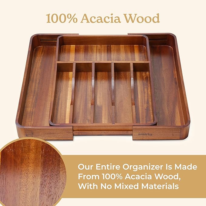 - A Must-Have Kitchen Accessory - Crafted from natural Acacia, our silverware drawer organizer blends with any decor. With a reinforced base and deep compartments, this kitchen drawer organizer fits most drawers, providing ample storage space.