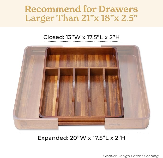 - An Organizing Space Saver - Our 8-compartment expandable Acacia kitchen drawer organizer adapts to fit any drawer size, providing customizable storage for silverware and kitchen utensils. This versatile design keeps your kitchen neat and organized.