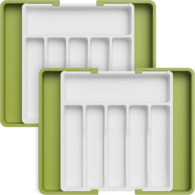 Lifewit Silverware Drawer Organizer, Expandable Utensil Tray for Kitchen, BPA Free Flatware and Cutlery Holder, Adjustable Plastic Storage for Spoons Forks Knives, 2 Pack, Green&White