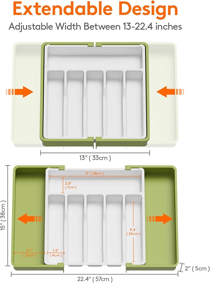 - Adjustable Size: With an adjustable width between 13 - 22.4 inches, it is compatible with different drawer sizes. When fully expanded, the cutlery box dimensions are 22.4 x 15 x 2 inches and when fully folded, it reduces to 13 x 15 x 2 inches. So no matter what size your kitchen drawers are, this utensil organizer will surely fit in