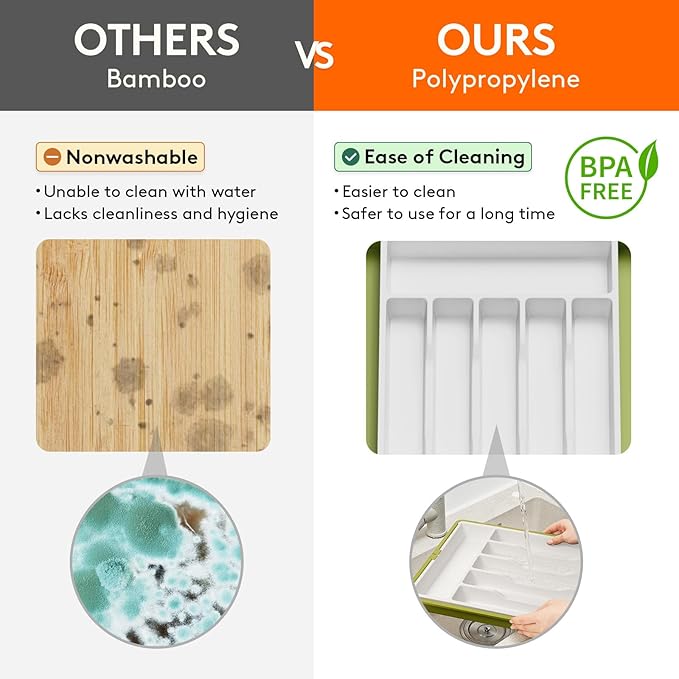 - Premium Material: Made of thick and sturdy premium PP material, the cutlery organizer is BPA free so you can rest assured that it is safe to use with all forms of tableware. The durable construction means it is built to last for a long time