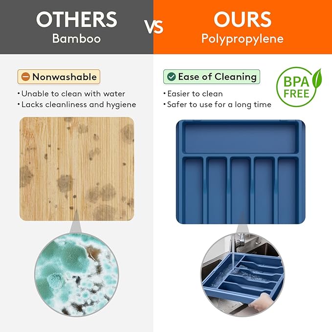 - Premium Material: Made of thick and sturdy premium PP material, the cutlery organizer is BPA free so you can rest assured that it is safe to use with all forms of tableware. The durable construction means it is built to last for a long time