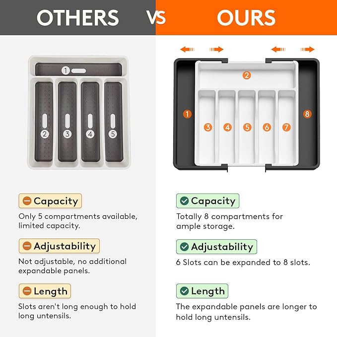 - Sort Your Silverware: With a total of eight compartments for easy sorting and storage, this kitchen drawer organizer allows you to easily recognize, identify & pick up the items you need for use