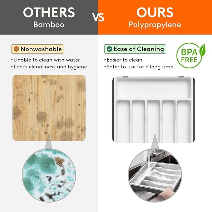 - Premium Material: Made of thick and sturdy premium PP material, the cutlery organizer is BPA free so you can rest assured that it is safe to use with all forms of tableware. The durable construction means it is built to last for a long time