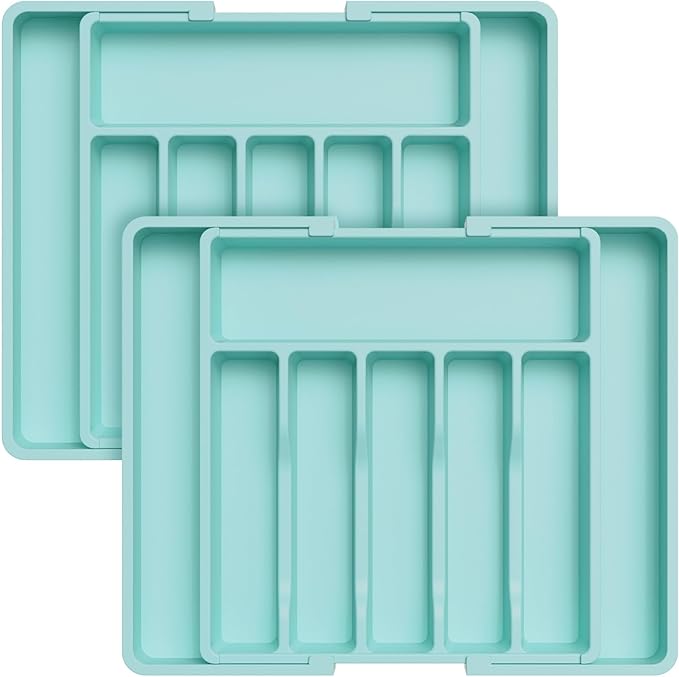 Lifewit Silverware Drawer Organizer, Expandable Utensil Tray for Kitchen, BPA Free Flatware and Cutlery Holder, Adjustable Plastic Storage for Spoons Forks Knives, 2 Pack, Turquoise
