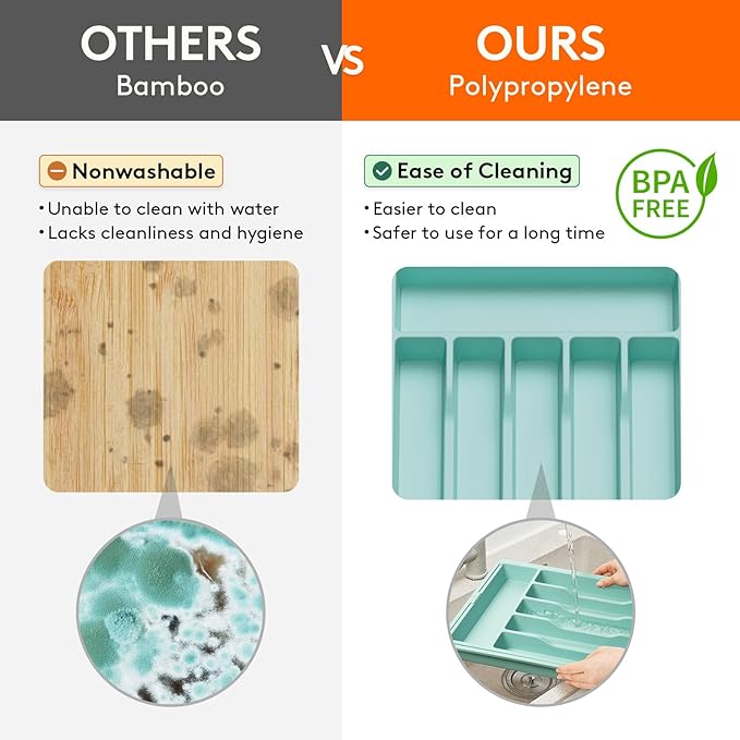 - Premium Material: Made of thick and sturdy premium PP material, the cutlery organizer is BPA free so you can rest assured that it is safe to use with all forms of tableware. The durable construction means it is built to last for a long time