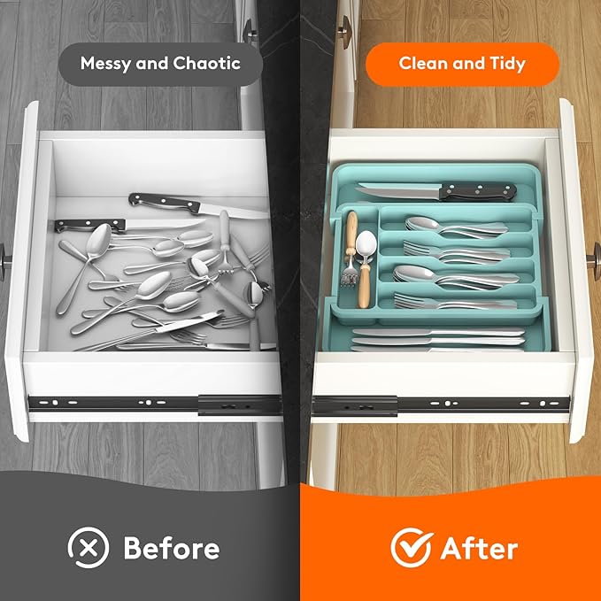 - Sort Your Silverware: Boasting 5 main compartments and 2 expandable layers this kitchen drawer organizer provides more space for your flatware, utensils, and other essentials. The expandable layers offer additional space when needed, making it a versatile and practical solution for organizing your drawers, maximizing your storage efficiency.