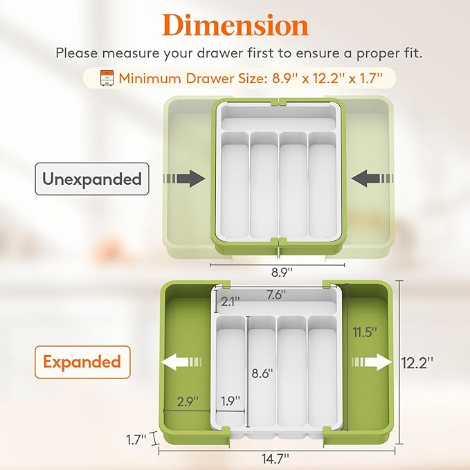 - Adjustable Design: This utensil drawer organizer is designed to be adjustable, accommodating various drawer sizes and shapes. When folded, it measures 8.9" x 12.2" x 1.7", and when unfolded, it extends to 14.7" x 12.2" x 1.7". The buckle design allows for smooth sliding and easy adjustment, preventing the dividers from slipping out of place.