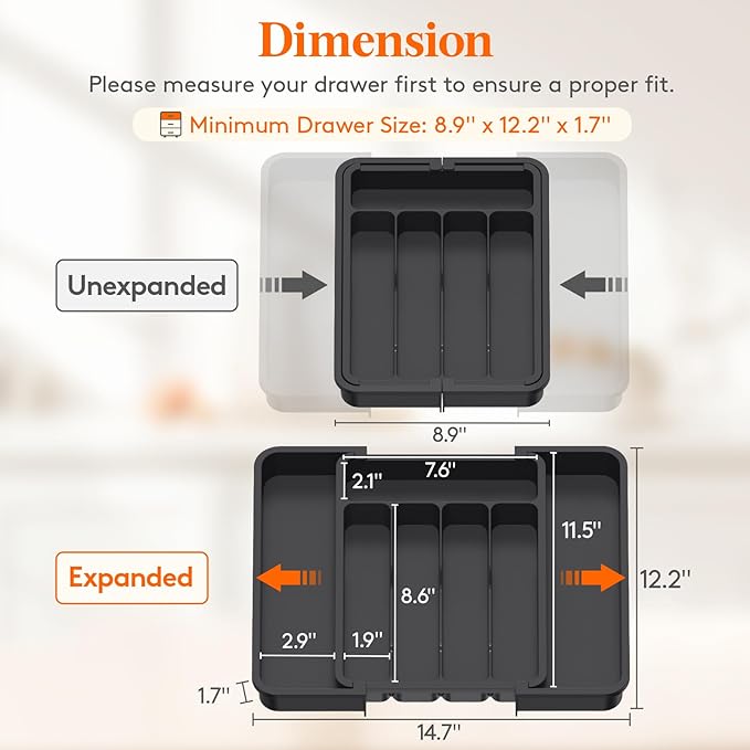 - Adjustable Design: This utensil drawer organizer is designed to be adjustable, accommodating various drawer sizes and shapes. When folded, it measures 8.9" x 12.2" x 1.7", and when unfolded, it extends to 14.7" x 12.2" x 1.7". The buckle design allows for smooth sliding and easy adjustment, preventing the dividers from slipping out of place.