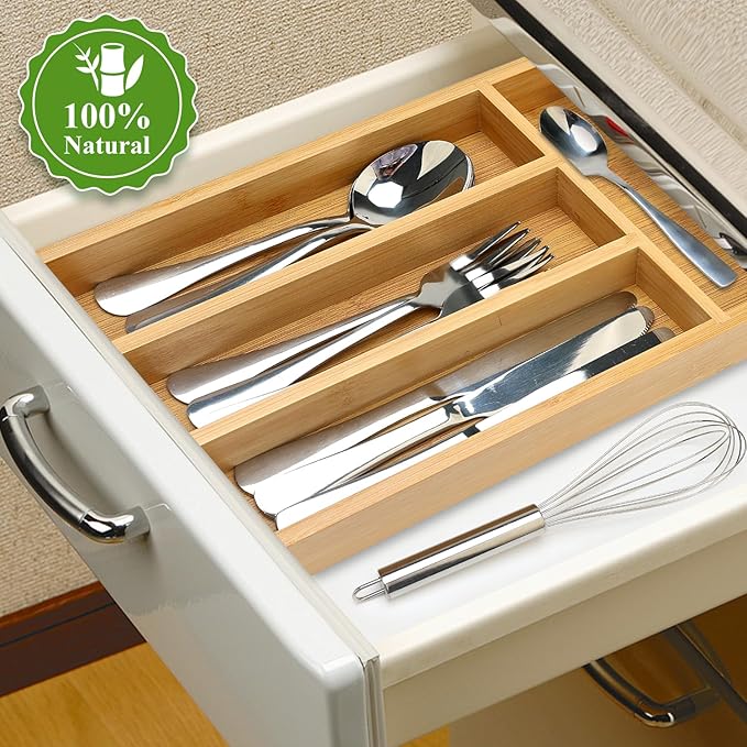 - SMALL UTENSIL DRAWER ORGANIZER: This bamboo silverware tray measures 12.8'' x 7'', which can accommodate most regular spoon, fork, knife and cutlery. We highly recommend to measure your drawer before order.