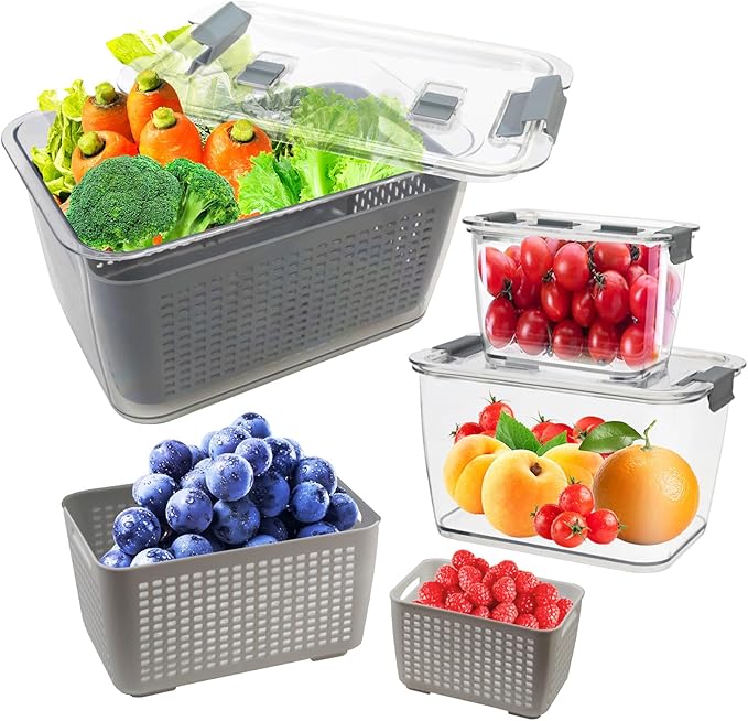 - Keep Fresher Longer : fruit containers with lids and colanders. These airtight containers are a great product for organizing fruits and veggies in the fridge. You will receive 3 piece refrigerator storage containers with filters, Capacity:4.5L / 1.7L / 0.5L. Suitable for most fruits, vegetables, berries. Refrigerator Pantry Organizer Bins Stackable Fridge Organizer Bins with Lids Clear Plastic Food Storage Bins for Kitchen, Countertops, Cabinets, Fridge, Drinks, Fruits, Vegetable, Carrot, Cereals and other veggies. kitchen storage container sets