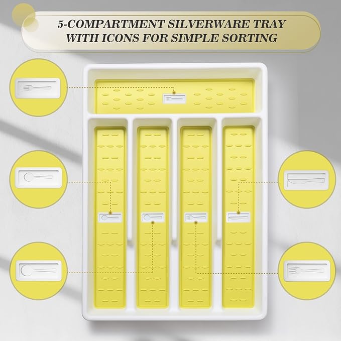 - 5-COMPARTMENT ORGANIZER WITH CUTLERY ICONS:It provides the perfect habitat for knives, forks and spoons and other kitchen necessities, and comes with icons to help you better store and sort,with this you will find that your kitchen drawers will be neat and organized.Measures 12.6"D x 8.9"W x 1.8"H,fits into most standard kitchen drawers.