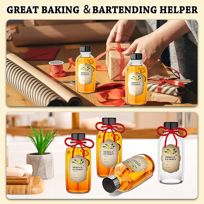 - 【Multi Uses】 the clear vanilla bottles with caps can be safely stored in the refrigerator, and they are suitable not only for storing vanilla essence, but also for vanilla beans, alcohol, liquor, beer, whiskey, ginger turmeric shots, hot sauce, salad dressing, juice, DIY essential oils, tincture, perfume, oils, vinegar, wine, syrup, potion and other liquids