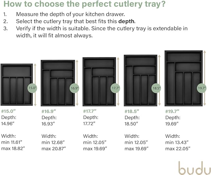 - ALWAYS THE PERFECT SIZE KITCHEN UTENSIL HOLDER: Budu offers width-expandable kitchen drawer dividers. Choose the depth-fit, and then slide for a perfect fit.