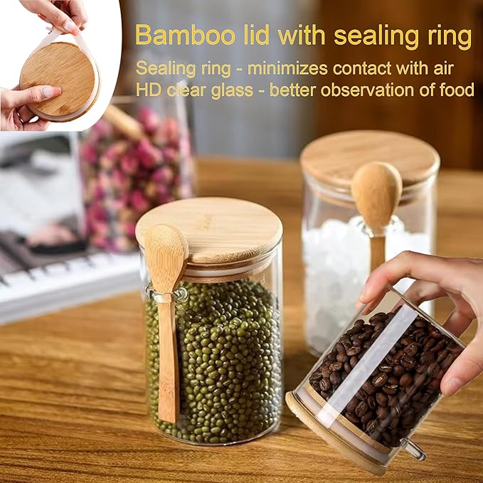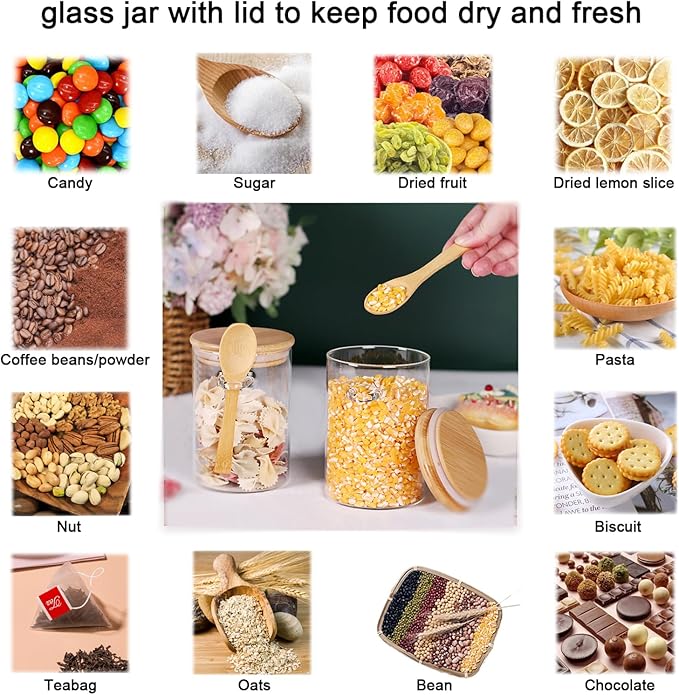 - Function: Very suitable for storing and displaying coffee beans, tea, biscuits, candy, nuts, oats, jam, dried fruit, beans, spices, sugar, salt and other snacks and food. High-definition transparent glass sealed jar, you can clearly see the food, to observe the food surplus.