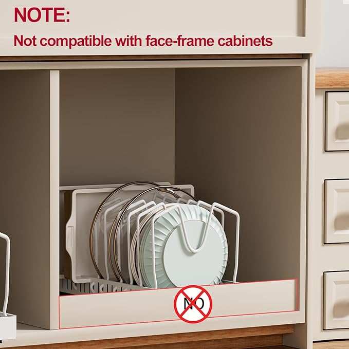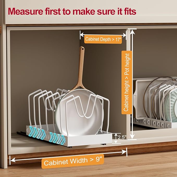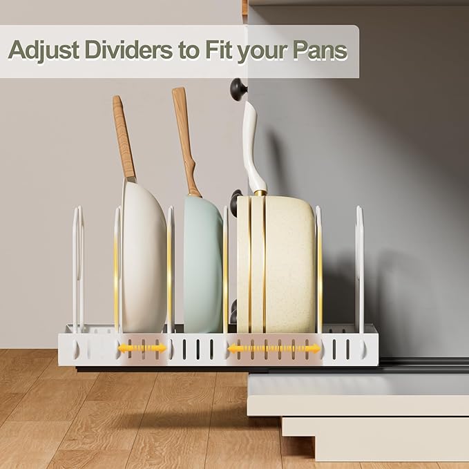- [ VERSATILE AND ADJUSTABLE DIVIDERS ] With 8 adjustable dividers per set, 1 sets total, this cabinet organizer isn't just for pots and pans. lt can accommodate everything from 6-12 inch lids and pans to cutting boards, baking sheets, and more. And when you remove the dividers, it transforms into a slide-out cabinet organizer. Ideal for small kitchens and apartments, it’s a must-have for anyone looking for adaptable storage solutions