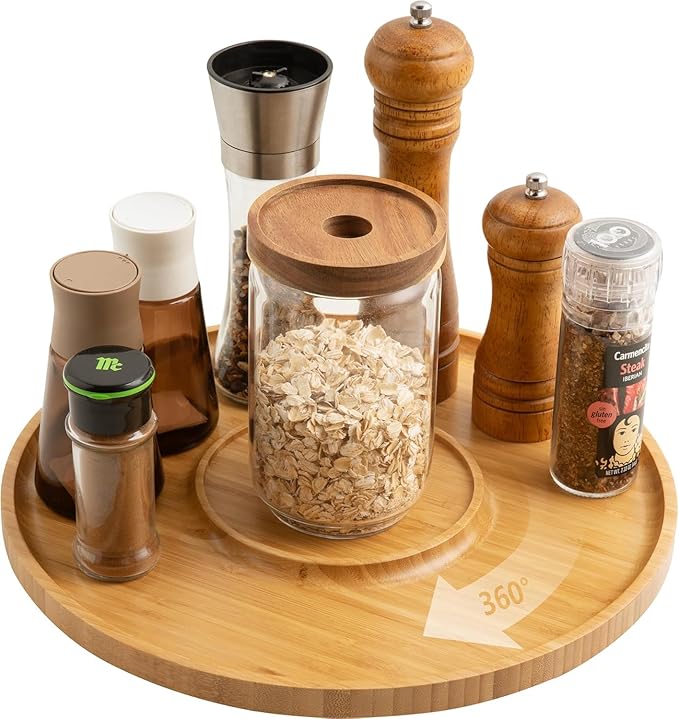 - Space Saver: This rotating lazy Susan organizer optimizes cabinet and countertop space, helping keep your kitchen neat and orderly.