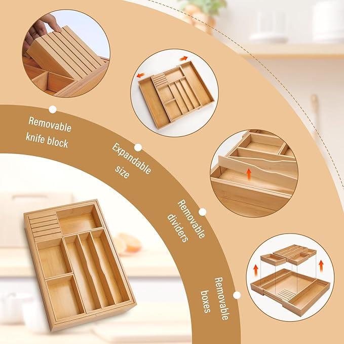 - Removable Knife Holder and Box: Our bamboo drawer organizers comes with a removable knife holder and small boxes. The removable knife rack can hold up to 5 steak knives; and you can remove or place the knife blocks as you wish. Besides, all the samll boxes inside can also be removed or combined as you like