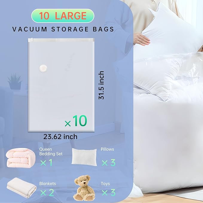 10 Large Vacuum Storage Bags, Vacuum Seal Bags for Clothing, Pillows, Comforters, Blankets, Space Saver Bags with Electric Pump