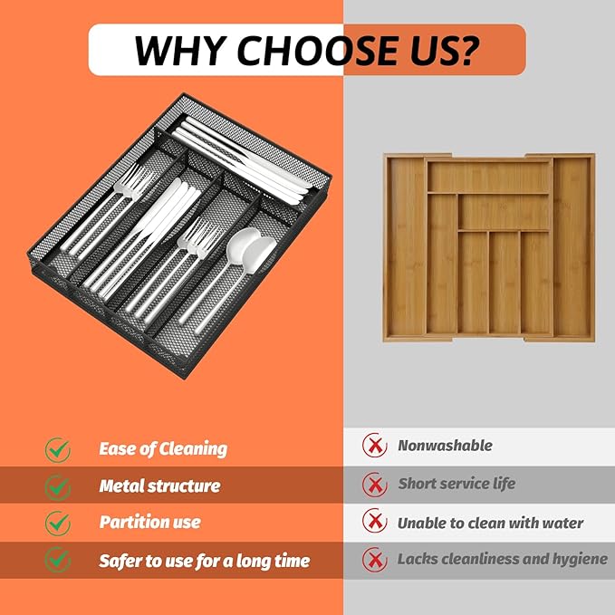 - [Durable Materials] Silverware organizer is made of sturdy eco-friendly carbon steel, coated with black epoxy coating, strong and durable, can protect your utensils from damage
