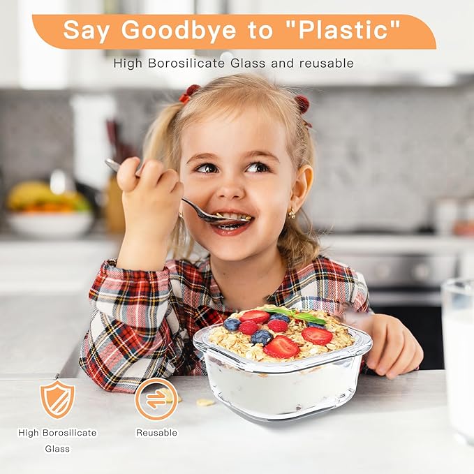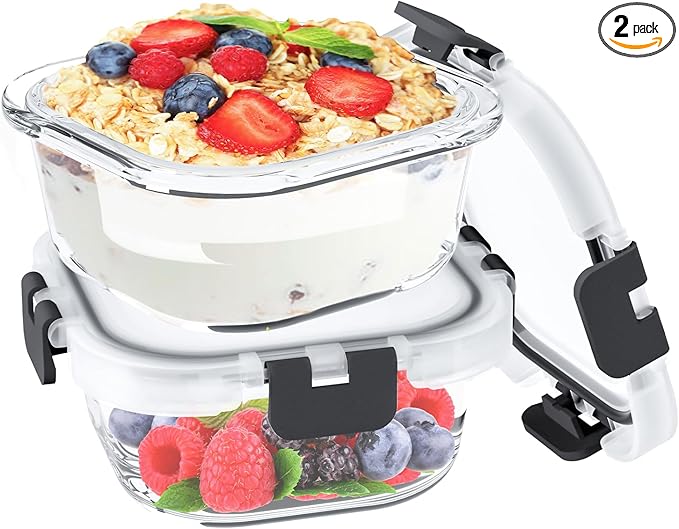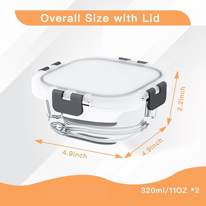 - Glass Bento Boxes: This 22oz set includes two 11oz snack container, each glass containers with a square design and a large capacity of 4.9 x 4.9 x 2.2 inches. Ideal for packing sandwiches, fruits, or snacks for lunches, providing ample storage while saving space in lunch boxes or bags