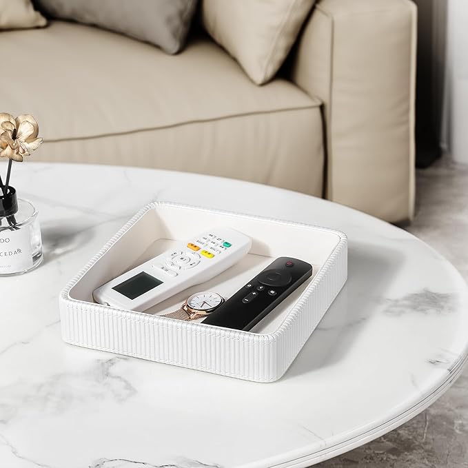 PU Leather Valet Tray Organizer, Small Nightstand Organizer Bedside Desktop Storage for Womens and Men, Perfume Trinket Catchall Vanity Tray for Key Watch Wallet (White, Square)