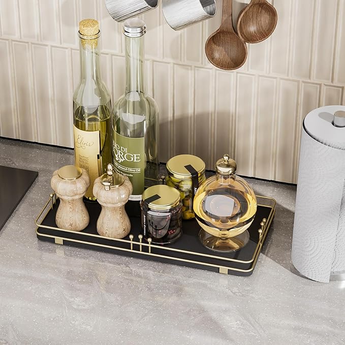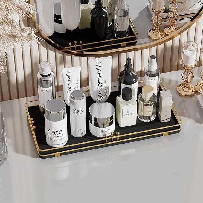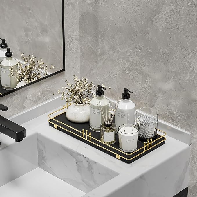- Versatile & Functional: Our bathroom basket enhances any space with its stylish design while serving multiple purposes throughout your home; Whether you use it as a bathroom tray, vanity tray, kitchen tray, decorative tray, perfume tray, jewelry tray, serving tray, catch-all tray, key tray, or toilet tank tray, it will keep your countertops tidy while adding a unique and stylish touch to any room