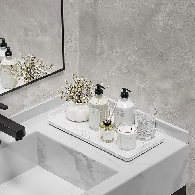 - Versatile & Functional: Our bathroom basket enhances any space with its stylish design while serving multiple purposes throughout your home; Whether you use it as a bathroom tray, vanity tray, kitchen tray, decorative tray, perfume tray, jewelry tray, serving tray, catch-all tray, key tray, or toilet tank tray, it will keep your countertops tidy while adding a unique and stylish touch to any room