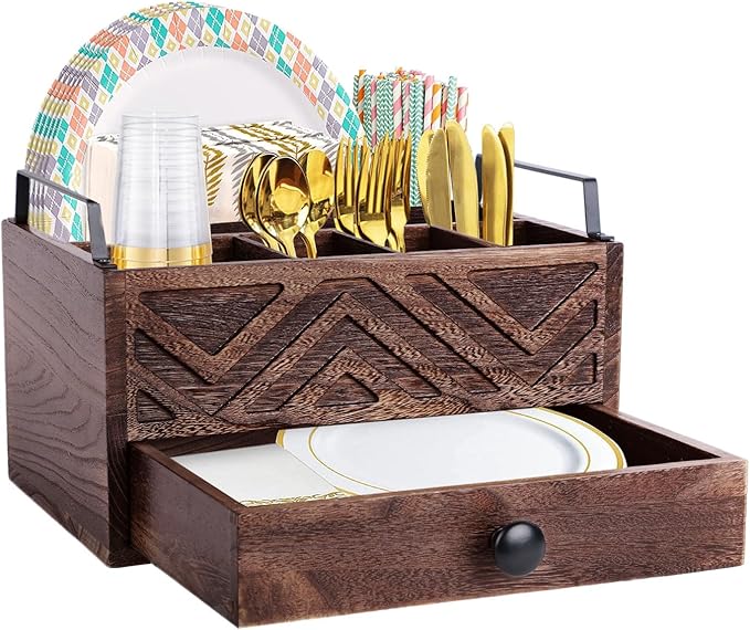 Paper Plate Dispenser with Drawer, country style Wood Kitchen Counter, Picnic, Party, Camping - Caddy Organizer for Cups, Spoons, Forks, Plates, office supplies, Napkins & Silverware