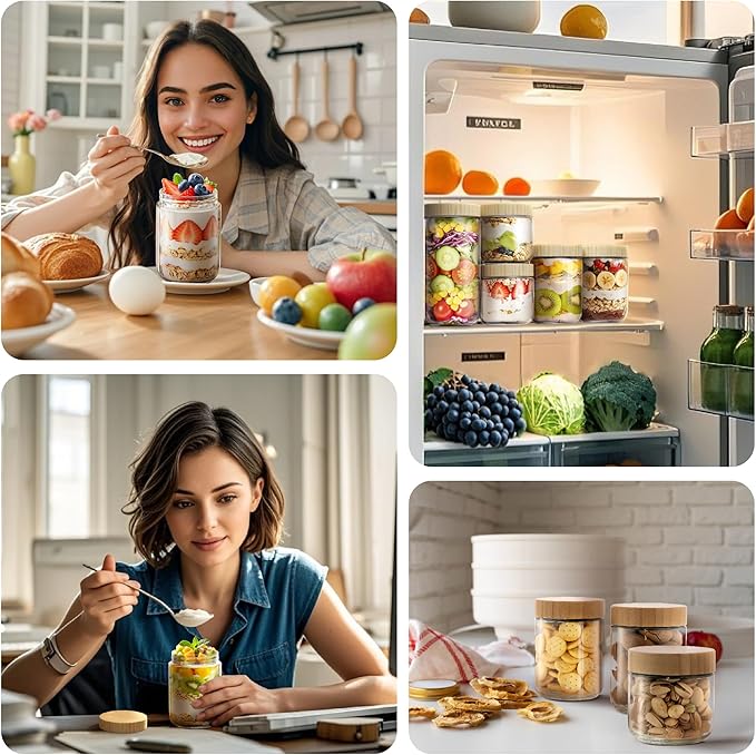 - [ Versatile Airtight Glass Jars for All Your Needs ]: Beyond overnight oats containers with bamboo lids, these glass storage containers with bamboo lids excel as yogurt jars, chia seed pudding jars, salad storage jars. Use them for homemade jams, pickles, sauces, spice, or even for craft projects and decorative displays. From food storage to DIY decor, their aesthetic design and functionality makes them seamlessly fit into any kitchen or home decor, making them an essential item for every home