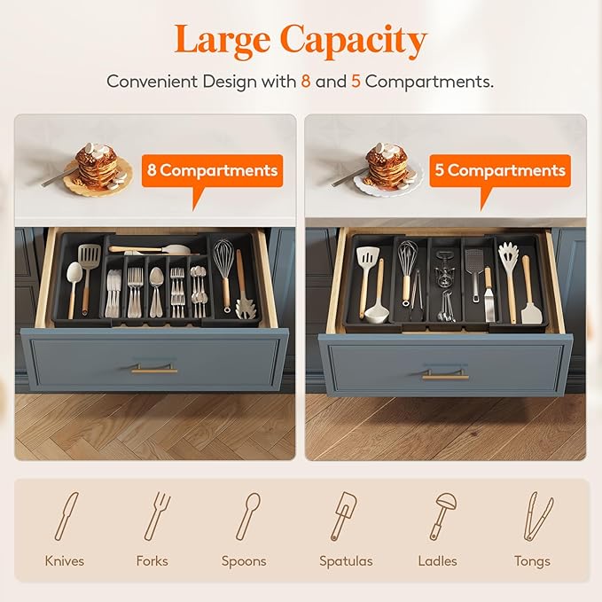 - Sort Your Silverware: The flatware organizer has 6-8 compartments for various knife, fork, and spoon sets. And the utensil organizer expands from 3 to 5 slots, offering ample space for larger cooking utensils like spatulas, spoons, tongs, and mixers