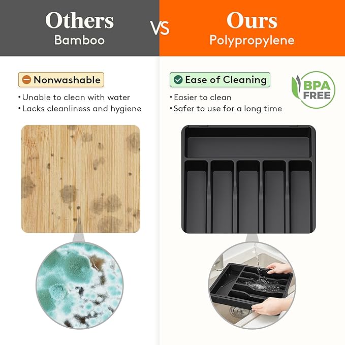- Premium Material: Made of thick and sturdy premium PP material, the silverware tray is BPA-free and sturdy so you can rest assured that it is safe to use with all forms of tableware. To clean, simply rinse with water to remove stains