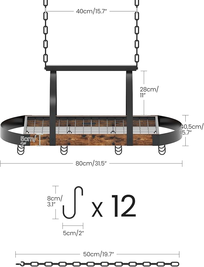 - High-Quality Materials: Crafted from premium particleboard and robust metal, this pot rack is built for long-lasting use. Its thickened double chains offer reliable support for your cookware, capable of holding up to 50lb with ease