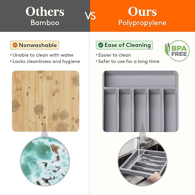- Premium Material: Made of thick and sturdy premium PP material, the silverware tray is BPA-free and sturdy so you can rest assured that it is safe to use with all forms of tableware. To clean, simply rinse with water to remove stains