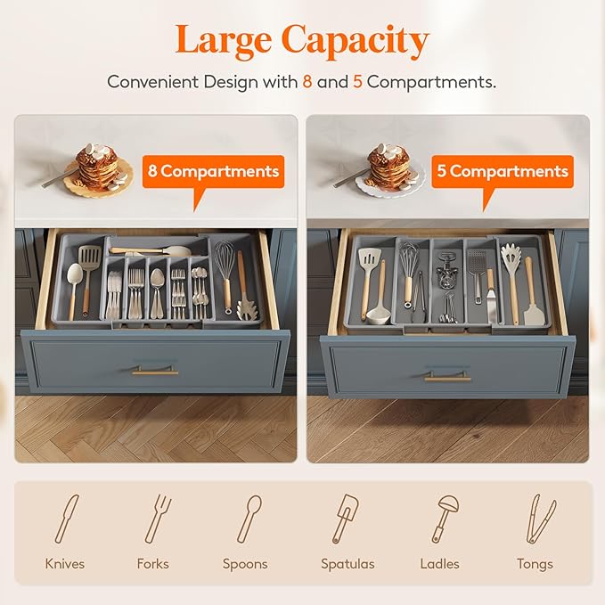- Sort Your Silverware: The flatware organizer has 6-8 compartments for various knife, fork, and spoon sets. And the utensil organizer expands from 3 to 5 slots, offering ample space for larger cooking utensils like spatulas, spoons, tongs, and mixers