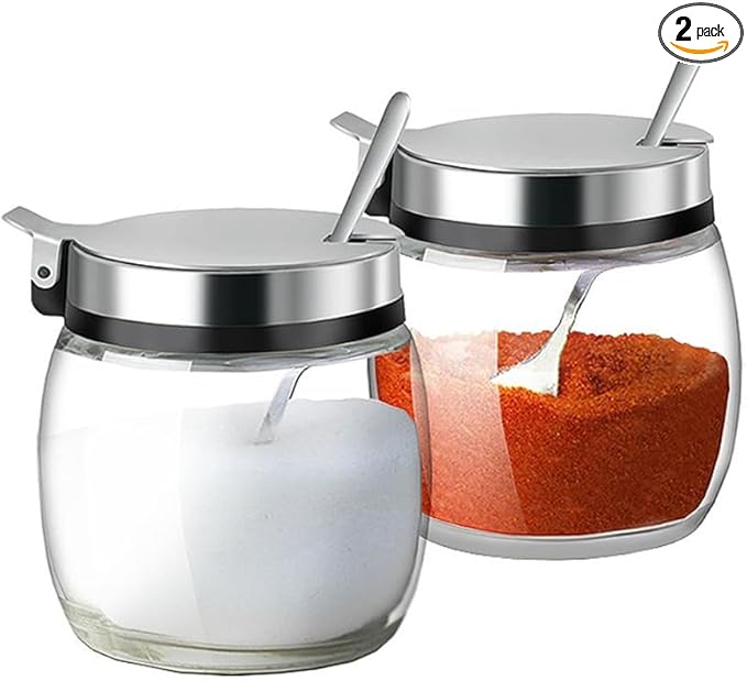 Hewnda 2Pcs Sugar Salt Container Set,8 oz glass jar with lid and spoon for storing condiments,coffee,sugar cubes,spices and more