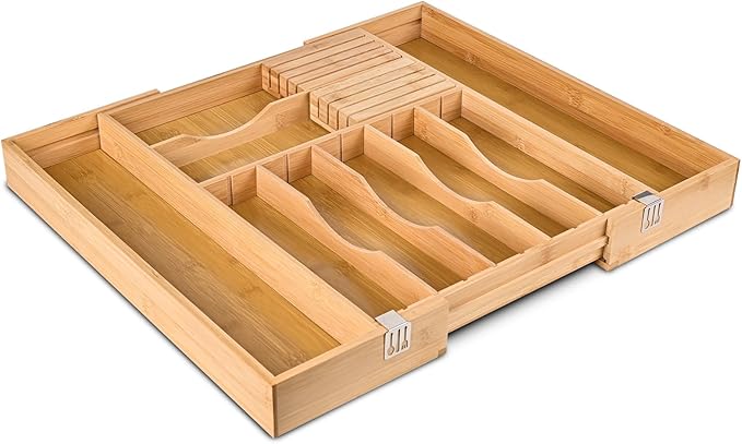 - Not only does our bamboo silverware organizer expand in width from 13.2 inches to 20.5 inches when fully open, there are a further 5 options to customize the size of the individual compartments.