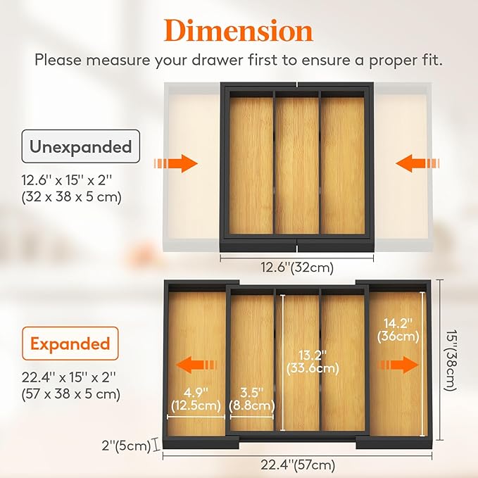 - Expandable Design: This utensil organizer for kitchen drawers can extend from 3 to 5 compartments, accommodating different drawer sizes ranging from 12.6 to 22.4 inches wide. Its folded dimensions are 12.6 x 15 x 2 inches, expanding to 22.4 x 15 x 2 inches