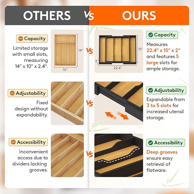 - User-Friendly Design: The silverware organizer has thoughtfully designed grooves for easy access to utensils without rummaging through cluttered drawers. Our utensil organizer is also easy to clean—just wipe it down for a like-new appearance
