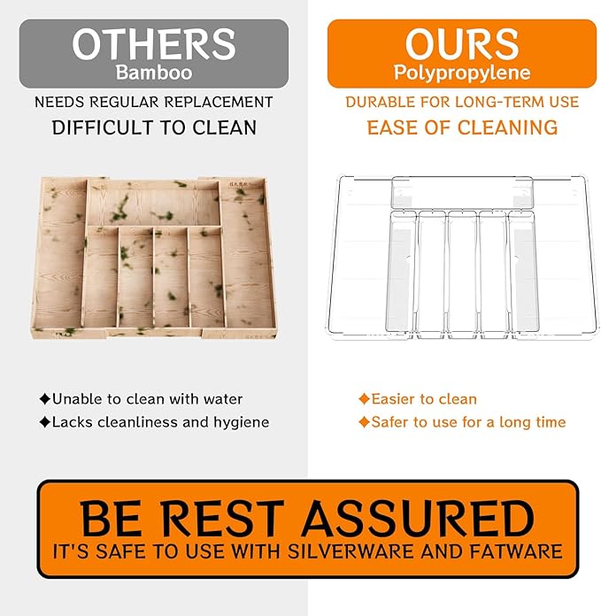 - 【Easy to Use and Clean】: Simply adjust the width of the organizer to fit your drawer, and you're good to go. The compartments are designed to hold a variety of items securely, ensuring they stay in place and don't get mixed up. Hygiene is effortless, making it ideal for storing kitchen utensils.