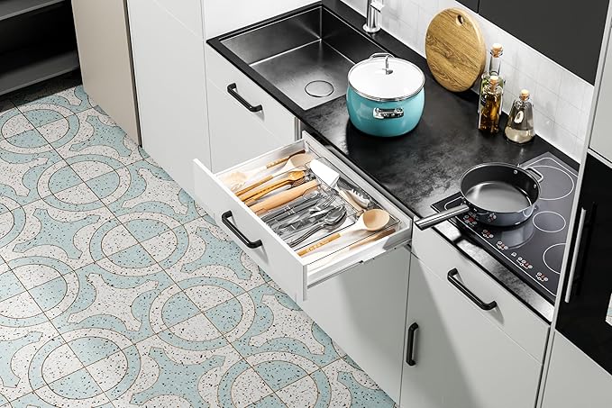 - 【Space-Saving Solution】: This kitchen drawer organizer maximizes every inch of drawer space. Say goodbye to wasted corners and hello to an orderly drawer filled with neatly arranged items. It's ideal for organizing silverware, utensils, and small kitchen tools, keeping them neatly arranged and easily accessible.