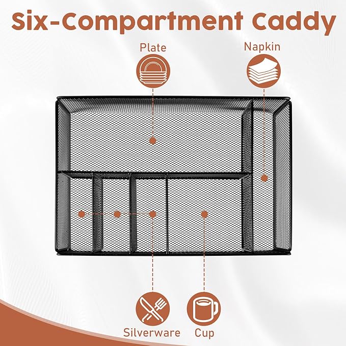 - Effortless Organization with 6 Separate Compartments: Keep your kitchen clutter-free with this versatile paper plate holder. Featuring 6 distinct sections, it helps neatly store and organize paper plates, napkins, utensils, straws, condiments, and more. The open-top design ensures easy access, allowing you to quickly grab what you need without any hassle.