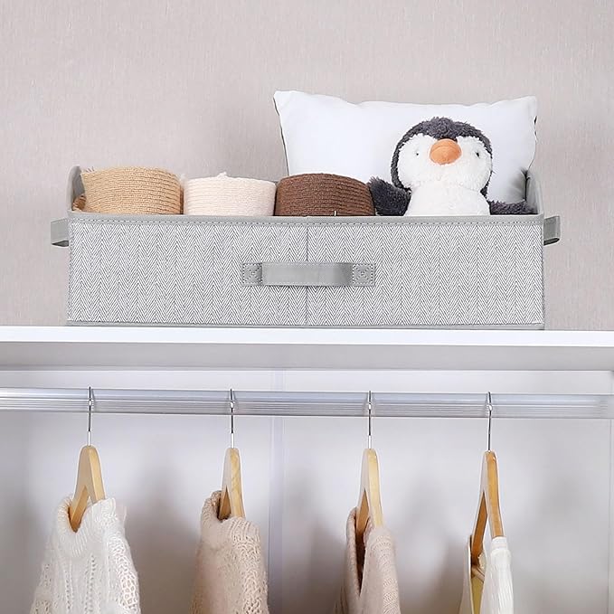 - Large Capacity & Sturdy Build: Measuring 19.5" (L) x 11" (W) x 8" (H/back) / 4.7” (H/front) with a 28L capacity, these closet baskets for shelves are reinforced with cardboard to resist deformation.