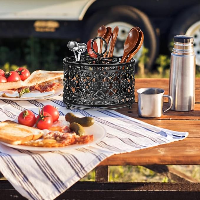 - [360° Rotating & Floral Design ] This cutlery caddy holder can rotate 360 degrees and can be easily picked up with just a slight rotation, making it very convenient! The sides with beautiful floral designs, and the bottom is designed with hollows to keep the countertop clean and ventilated.