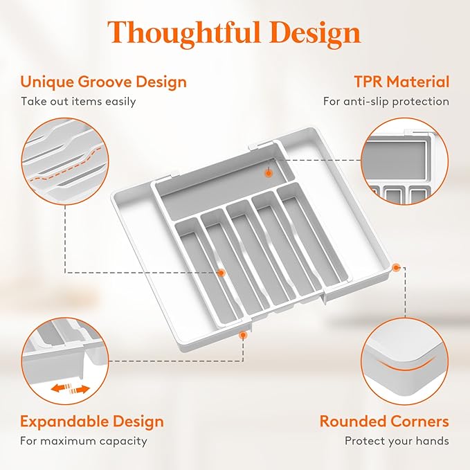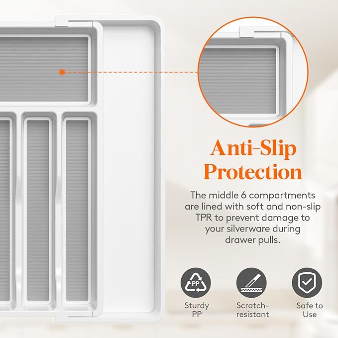 - Anti-Slip Protection: The middle six compartments of this kitchen drawer organizer are lined with soft yet non-slip TPR to prevent damage to your silverware during drawer pulls, offering excellent protection for your silverware
