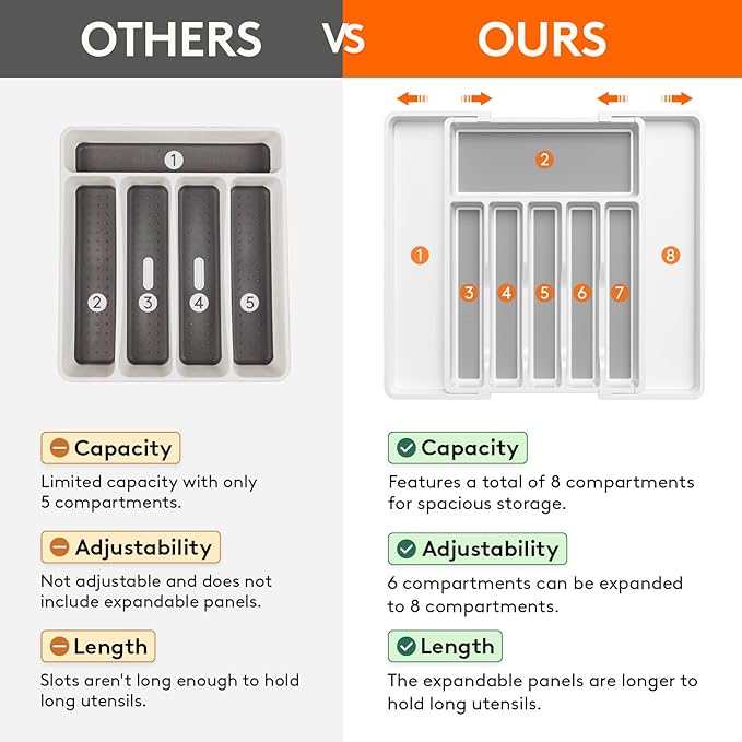 - Large Capacity: This cutlery drawer organizer features six middle compartments and two expandable side panels to maximize storage space for utensils, cookware, and various kitchen items, keeping your kitchen drawers tidy