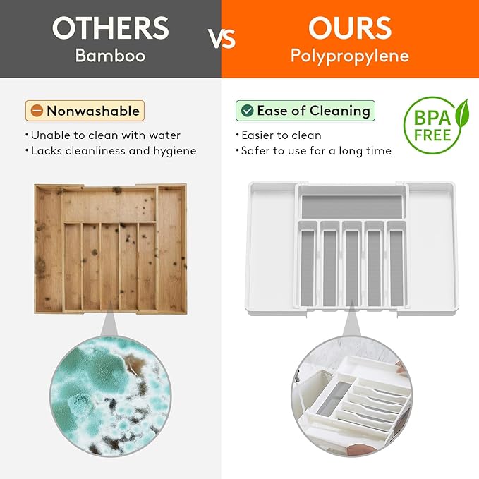 - Premium Material: Made of thick and sturdy high-quality PP and TPR materials, this flatware organizer for drawer is sturdy, long-lasting, and free of BPA, ensuring safety for all types of utensils and easy cleaning with water
