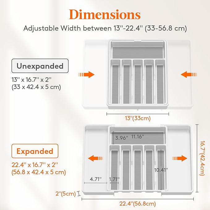 - Expandable Design: This silveware organizer can expand from six to eight compartments with an adjustable width range of 12 - 20.2 inches (30.6 - 51.4 cm), fitting drawers of different sizes. When fully expanded, its size is 22.4 x 16.7 x 2 inches (56.8 x 42.4 x 5 cm), and when folded, its size is 13 x 16.7 x 2 (33 x 42.4 x 5 cm)